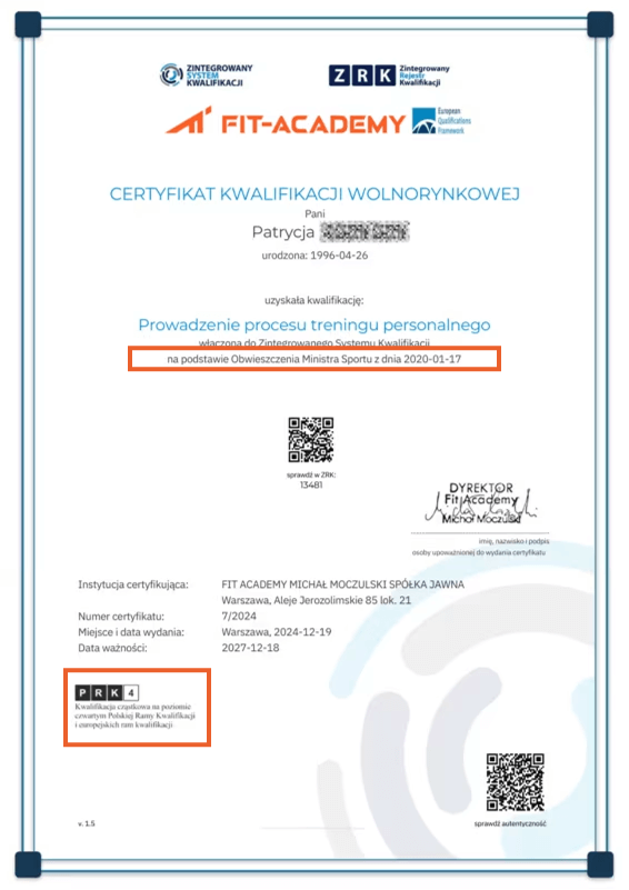 Po kursie Trenera Personalnego Fit-Academy OTRZYMASZ JEDYNY NA MOCY PRAWA CERTYFIKAT KWALIFIKACJI W RAMACH ZINTEGROWANEGO SYSTEMU KWALIFIKACJI I EUROPEJSKICH RAM KWALIFIKACJI EQF4 + Certyfikaty MEN świadczące o wykonanym szkoleniu w ramach placówki kształcenia ustawicznego.