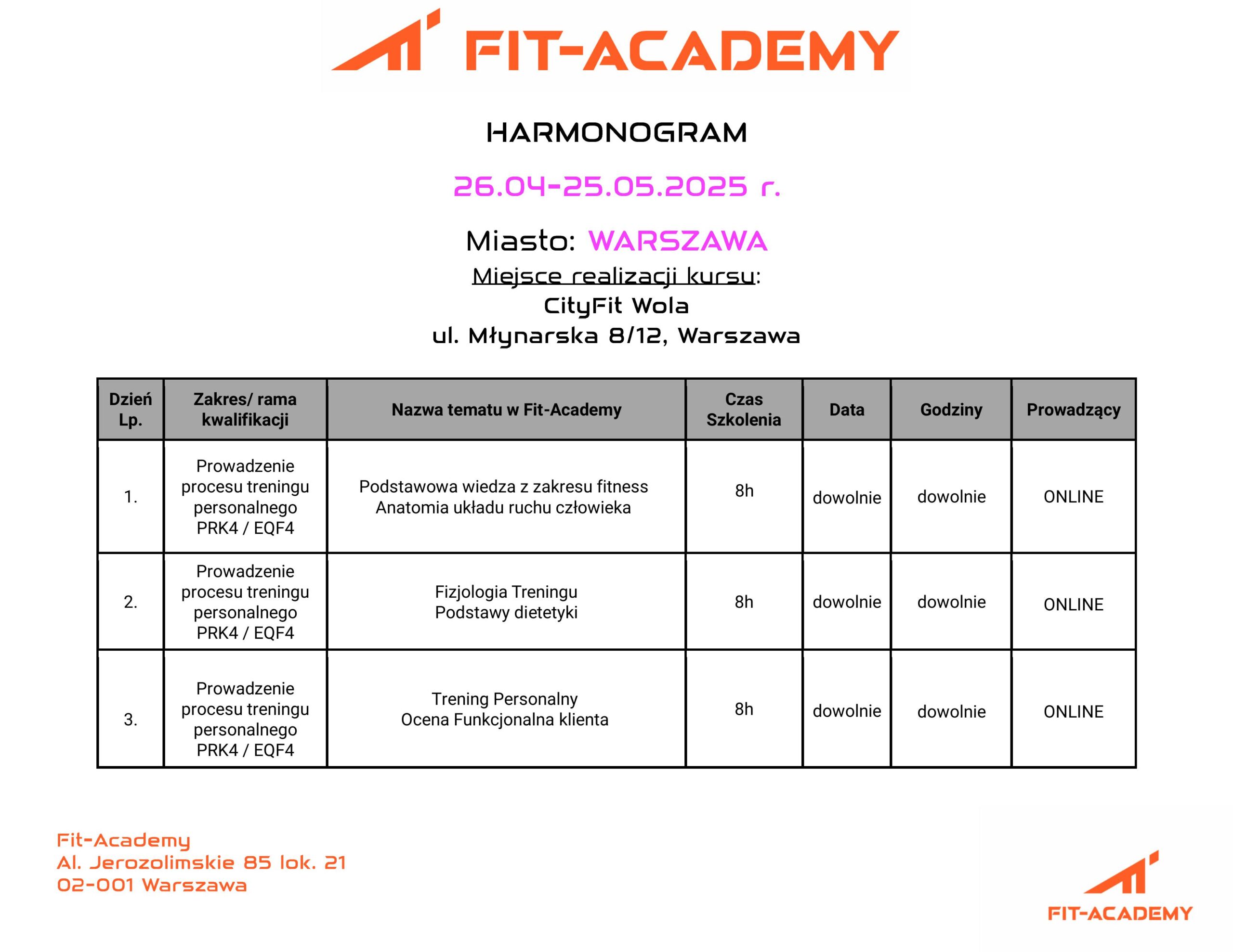 Kurs odbędzie się w CityFit Warszawa PDT Wola, ul. Młynarska 8/12, 01-194 Warszawa