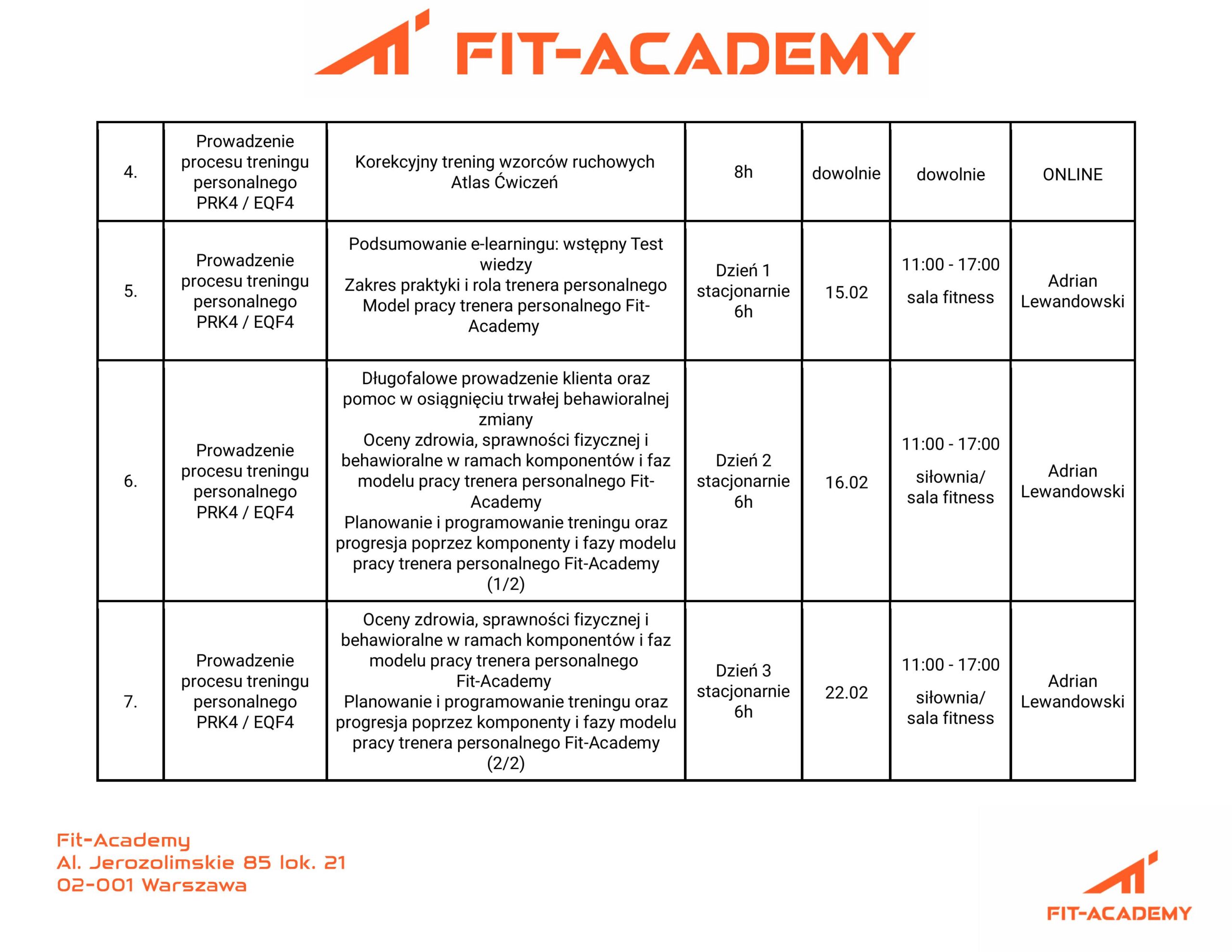 Kurs składa się z 5 modułów: Tutaj znajdziesz szczegółowy opis każdego z nich. Pierwsze dwa moduły stanowią wiedzę prezentowaną w formie wykładów oraz materiałów instruktażowych na naszej platformie e-learningowej. Kursant Fit-Academy zapoznając się z materiałami online w trakcie trwania dwóch pierwszych weekendów kursu - przygotowuje się do trzech kolejnych modułów, które w 100% są !ZAJĘCIAMI PRAKTYCZNYMI!