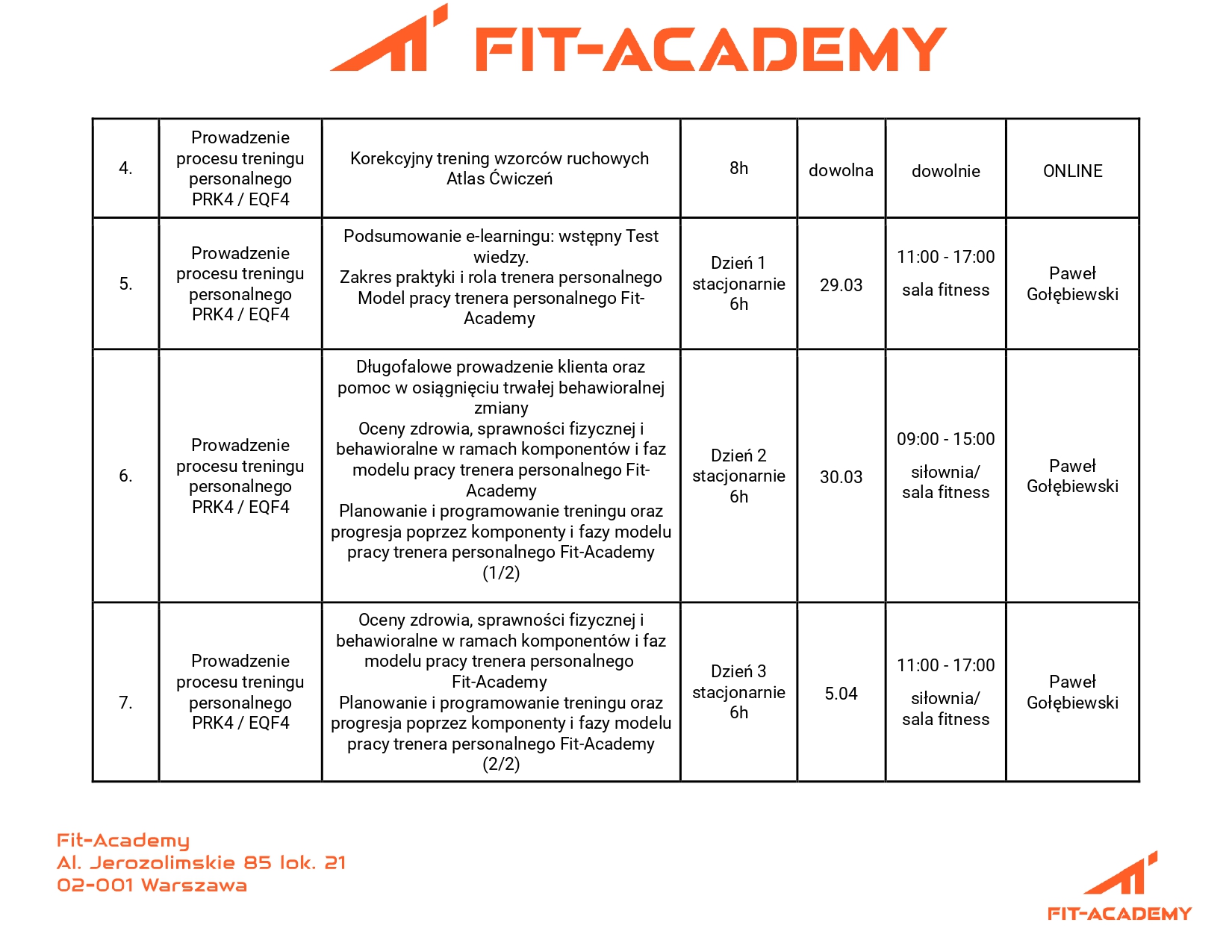 Kurs składa się z 5 modułów: Tutaj znajdziesz szczegółowy opis każdego z nich. Pierwsze dwa moduły stanowią wiedzę prezentowaną w formie wykładów oraz materiałów instruktażowych na naszej platformie e-learningowej. Kursant Fit-Academy zapoznając się z materiałami online w trakcie trwania dwóch pierwszych weekendów kursu - przygotowuje się do trzech kolejnych modułów, które w 100% są !ZAJĘCIAMI PRAKTYCZNYMI!